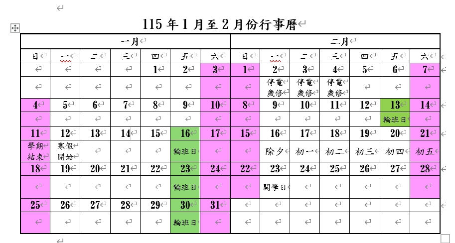 二、為落實節能減碳及維持行政運作,調整115年1月12日(一)至2月13日(日)寒假上班為週一至週五,上午9:00至下午4:301/16、1/23、1/30及2/13採「彈性輪班集中上班」方式。彈性輪班集中上班地點為圖書館5樓G502,座位圖及分機安排,依總務處公告辦理。